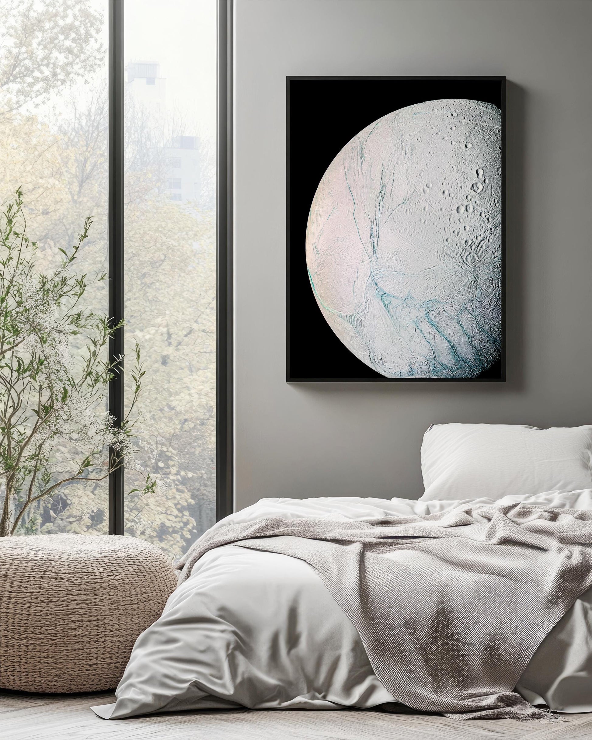 This Enceladus moon print captures the icy surface and mysterious features of Saturn’s intriguing moon, offering a stunning focal point for any space-themed wall decoration. Taken by NASA's Cassini mission, this high-quality space poster reveals the famous tiger stripe fissures art near the south pole, where plumes of water vapor erupt from beneath the subsurface ocean image. Perfect for fans of planetary exploration decor and science enthusiasts, this minimalist space decor blends scientific accuracy with modern design to elevate your room.